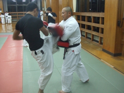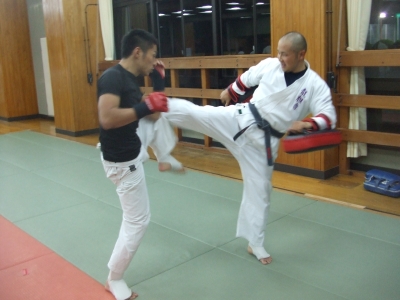道場ではマー君とよっちゃんが子供の指導&伝統派空手の稽古。適当に時間を潰して道場の隅っこでアップ開始。マー君は早速ミットを持って欲しくてしょうがないらしい。今日は10人組手を控えたよっちゃんの練習をメインでやる事にする。