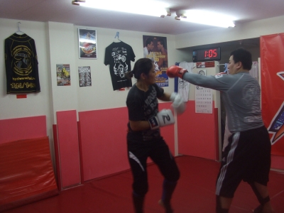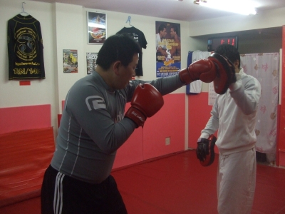 KH君とは初マス。対面するとデカイ・・。しかしトロルよりは身長がないのでちょこちょこと攻撃を当てる。まだ遠慮してくれているので今の内に当てておかねば。KH君はローとパンチへの反応が凄く良い。しかしミドルと前蹴りはもらいがち。ってこの2つのディフェンス、さっきRICKYに教わってたばかりだからね。その前の週に何度かやってたパンチとローのディフェンスが出来ている辺り、末恐ろしい。