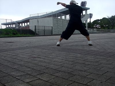 釣りで結構汚物化してしまったので、S市トレ室は諦めて運動公園へ。ここは球場やらサッカー場やらテニスコートやら何やら、とにかく広大な敷地内に色々あるとこ。そこの陸上競技場の周りが、いつも俺のトレーニング場所だ。