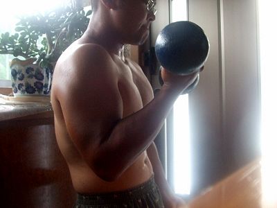全盛期はダンベルショルダープレスは30kgでやってたのに、今は10kgの鉄アレイ。衰えたものよ。それでも限界まで回数をこなす。間髪入れずにアームカール。所謂スーパーセットだ。これを3回繰り返したら、もう腕が動かないぐらいにキンキンに。この重量でも意識と効かせ方で少しは鍛えられる。最大筋力は無理だけどね。筋持久力なら大丈夫だ。