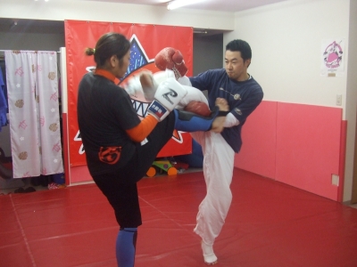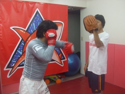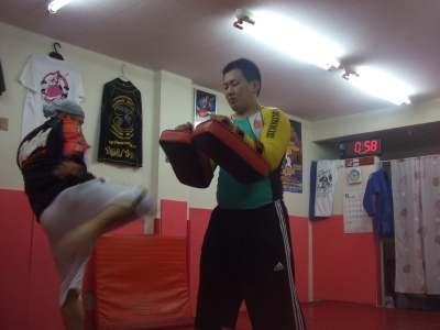 やたら凄いキック音が聞こえて来たので振り向いたらRICKYの顔がお爺ちゃんみたいになってた。KH君は先週よりも確実に進化している。この捻り、2回目のキックミット打ちとは思えない。恐るべし。