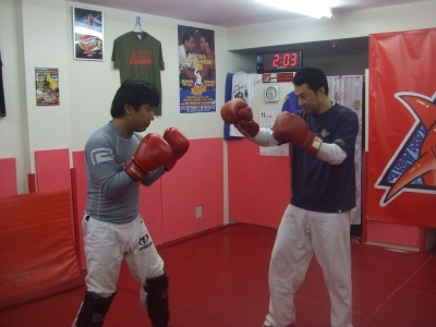 RICKY地獄変はまだまだ続く。RICKYは限界に近づくと咳が出るので分かりやすい。既にコホコホしてるので危険だ。猛獣YKさんと。サウスポーにこういう風に距離をとられると非常に攻めづらい。次回は俺の主武器でもあるカウンターの打ち方を教えようっと。RICKYも確実に進化してるなぁ。YKさんは余裕すぎて言う事無し。でも本人は全く納得せず。