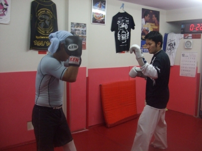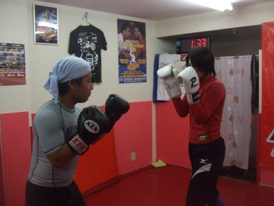 赤鮫内はかなり賑やかな状況に。とりあえず皆でミット。見学&体験に来た女性はYKさんの指導で色々と。グルグル回ってミットも修了、対人練習をちょこっとやってマスに。これはDAIちゃんとTYさん。