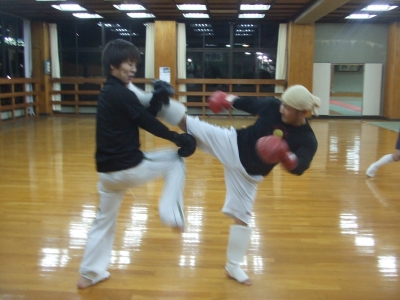 終盤、よっちゃんの右のガードが低いので俗に言うブラジリアンハイキック。身長差10cm以上だが綺麗に入った。ってこの瞬間を撮ったKはマジで凄い!クリックして拡大して見るべし!俺カッコイイ!とりあえず、M塾はこれぐらいは超軽めのスパーです。
