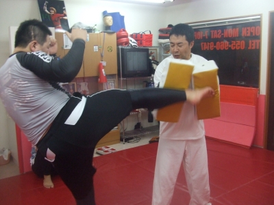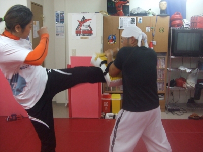 フックやアッパーはやはり体格の分、破壊力が凄い。ミットが吹っ飛んでいってしまった。大うけするYKさん。KH君も教えた事がすぐ出来るので楽だ。キックミットは命懸け。とは言ってもまだフォームが固まってないので助かっている。