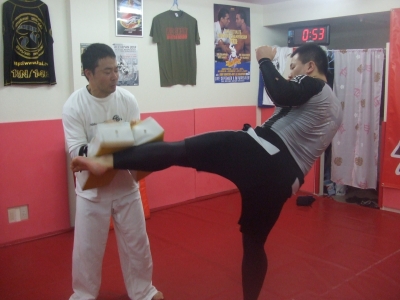 どうもインパクトの位置が合ってない気がしたので、修正してもらう。すると尻を蹴られなくなった。俺はその気はないので助かった。ローもミドルも修正後の方が断然蹴れてる。良い感じ♪