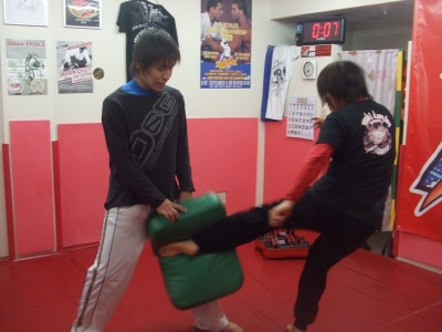 ドスドスとキックミットを蹴りまくるクイーン。このインロー、メッチャ痛い。ってよっちゃん!明日試合で大丈夫なの~?!逃げたくせに心配するずるいオジサン。
