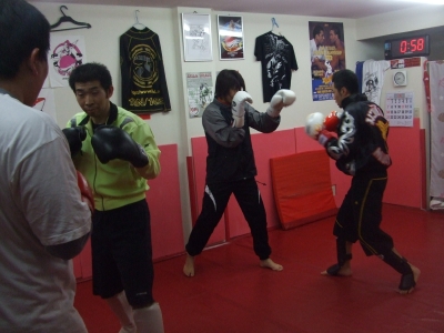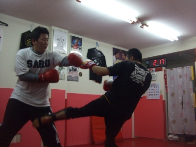 KH君はジャブからインローのタイミングを完全につかんだ感じ。ジャブから左ミドルはもうちょっとかな?ここの人はサウスポー多いし、オーソドックスも動きが速い人が多いから色々小技を使ってからの方が当たるかな。
