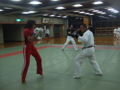 仁王様とは全く違うスタイルのOTマー君。軽快な動きから速いパンチや蹴りを入れて来る。YKさんが先日から反復練習していたコンビを当てるのを見て感無量。しかしマー君も変則ハイで頭部をかすめる。このハイで先日の試合は2人をぶっ倒したからね~。