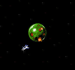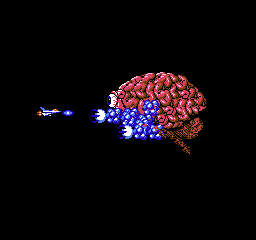これがファミコン版のラスボス。でかい目玉の周りをイモムシ、いやドラゴンらしき生き物がグルグル回る。もしやこれが沙羅曼蛇なのか?!弱そうな見た目通り、本当に弱い。目玉もただボケッとしてるだけだった。