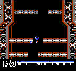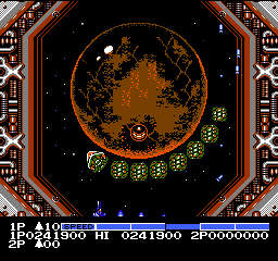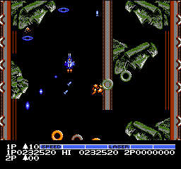 アーケードは敵を倒すとアイテムがそのまま落ちてたのだが、ファミコン版はグラディウス同様、カプセルを集めてのパワーアップ方式になっている。容量の問題だろう。あとはオプション(マルチプル)が3つまでしかつけられない事や、グルグルバリアがフォースフールドになってたり、多数の変更点がある。しかしそれらは劣化でも欠点でもなく、ファミコン版のアレンジと思えば良い。贅沢は敵だ。MSXなんて大抵のゲームは雑魚敵が単色なんだぞ!