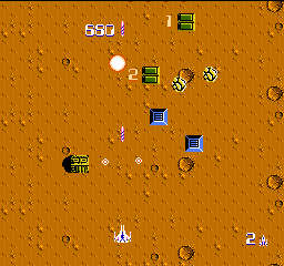 パッと見はオーソドックスな縦スクロールのシューティング。地面に埋まってる数字が書いてある地上物を撃つとパワーアップアイテムが出現する。0~7番まであって、それぞれに一長一短がある。続けて同じ数字を取ると更に強化される。通常弾は画面の青い空中物を壊すと緑?の玉が出るのでそれを取るとパワーアップ。これも何段階か強化される。