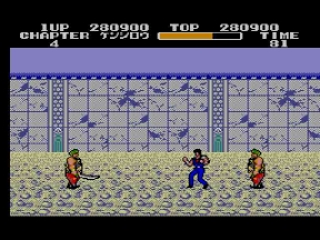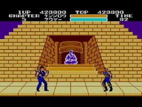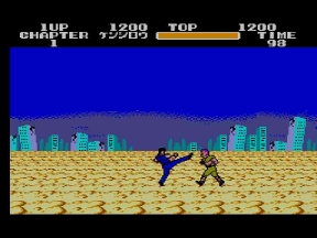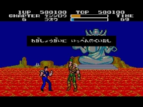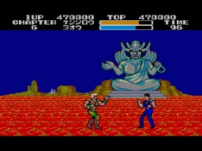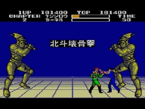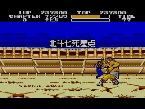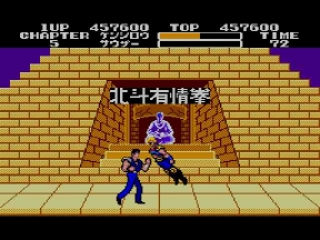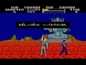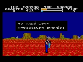 そしてデビルリバース戦。当時のハードでは流石にあの大きさは再現出来ないが、ここでもマークⅢ版開発スタッフの妙技が光る。ボス戦はキャラが大きくなっていたが、ここではケンシロウだけ通常ステージサイズのまま。やるぜ!セガ!コイツは羅漢仁王拳の使い手。手から何かを発射するので要注意。波動拳のルーツはここか?!