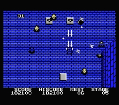 白黒に点滅する物体を撃つと、今度は武器チェンジが出来る。初期装備は1本矢だが、剣、ブーメラン、火矢、3ウェイ火炎弾、2本矢のどれかを選べる。また、続けて同じ武器を取れば、その武器がパワーアップする。