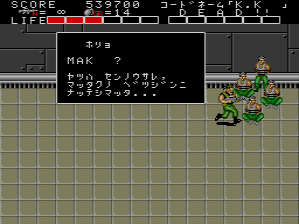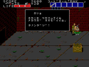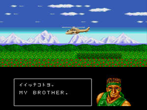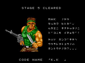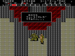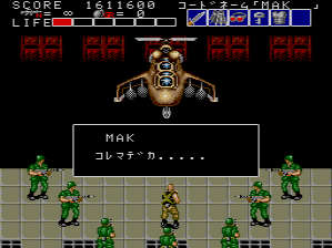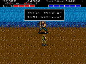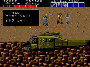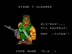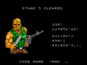 画面は暗転し、ならず者部隊の上官の顔のアップに。「MAKが捕まったから助けに行け」みたいな事を言われるシュワもどき。今度はシュワもどきを操作してハゲを助けに行くのだ。何と熱い展開なのか。全くストーリーを忘れていたのでワクワクしながらプレイしてしまった。こういうとこがこのゲームの凄いとこだ。