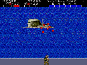 今度は縦スクロールで進んでいく。ボスは潜水艦。ハゲマッチョ1人でどうにかなるもんじゃないが、そこはゲーム。しかもデコ。この潜水艦、こちらの足場をミサイルで壊していくというなかなかの攻撃をしてくれる。イースみたいだ。