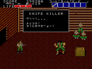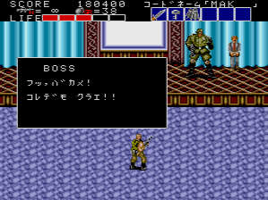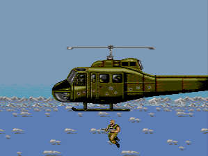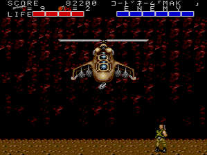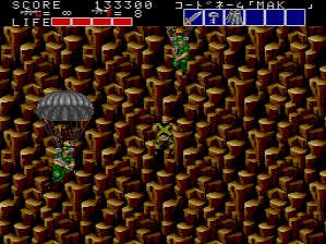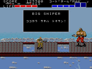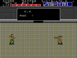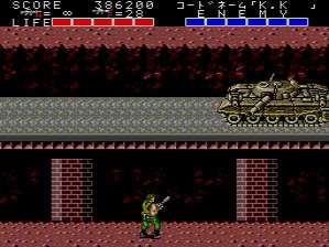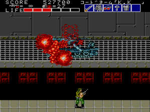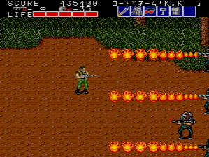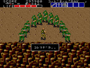 一見、在り来たりなゲームと思われがちだが、このゲーム、そんな底の浅いゲームでは無いのだ。8方向に銃が撃て、ジャンプ可能、更に敵に接近するとナイフでの白兵戦になる。これがまた後に良い演出に・・今はやめておこう。